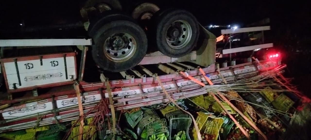 Caminhão carregado de frutas e verduras tomba na BR-407, em Geminiano