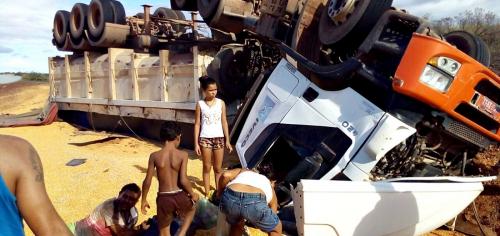 Carreta tomba e deixa duas pessoas feridas na PI 245, próximo a Vera Mendes