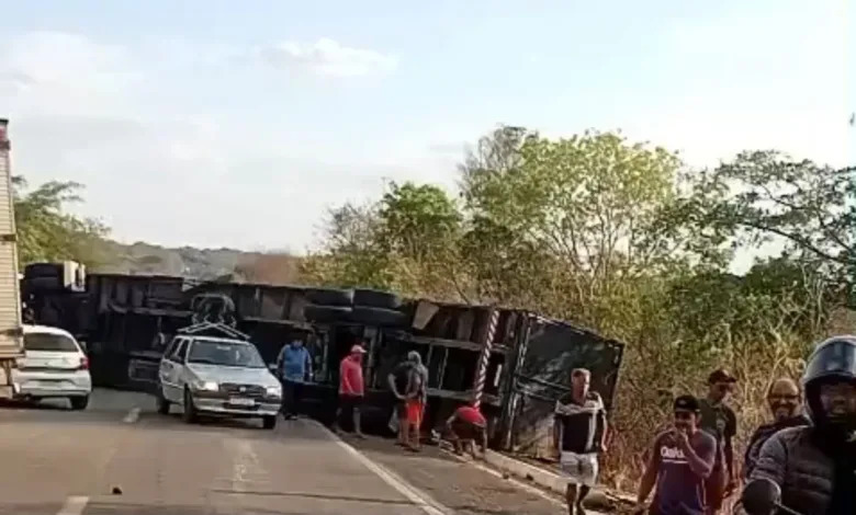 Carreta tomba e deixa BR-316 totalmente interditada em Inhuma