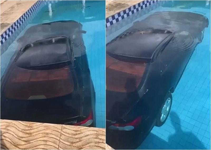 Um carro Corolla invadiu a piscina de um hotel e quase atingiu duas pessoas que estavam banhando