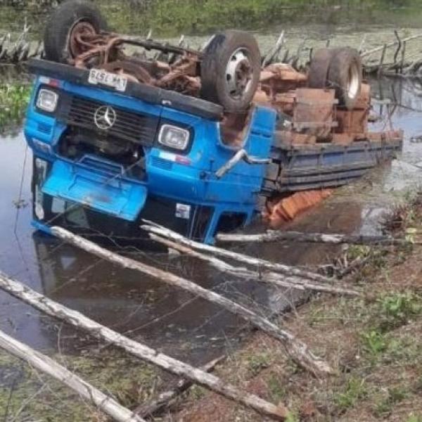 Caminhão com material de construção sai da pista e cai dentro de açude no PI