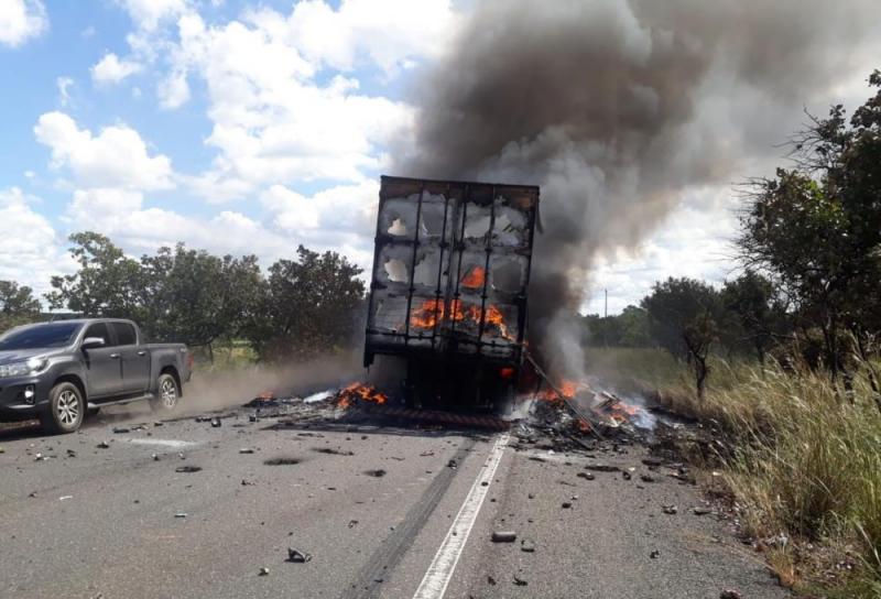 Carreta carregada de produtos fica destruída após incêndio na BR-316