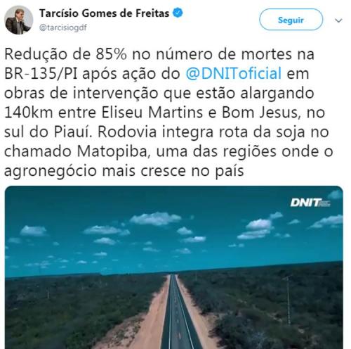 Ministro diz que duplicação reduz em 85% mortes na rodovia 135 no Piauí
