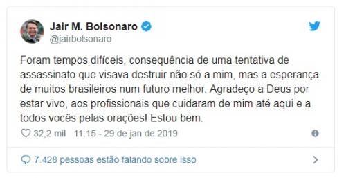 'Estou bem', diz Bolsonaro no Twitter ao comentar sobre seu estado de saúde