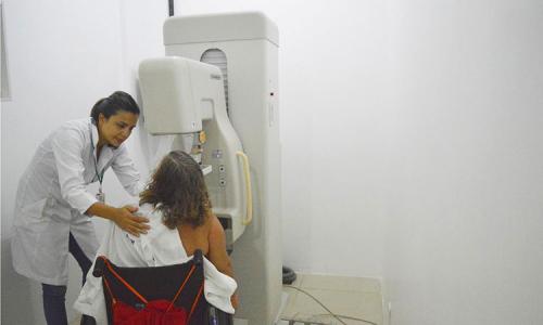 A tecnóloga em Radiologia Carmem Almeida explica que o aparelho que realiza a mamografia tem a possibilidade de descer e pode chegar à altura da paciente cadeirante.