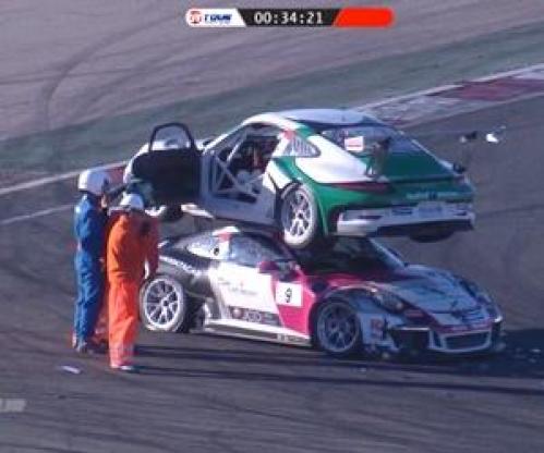Acidente na Porsche Carrera Cup termina com carro em cima do outro na Espanha