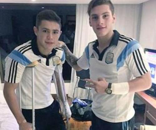 Mesmo assim, em imagem divulgada na internet, ele apareceu de muletas e com faixas nas mãos