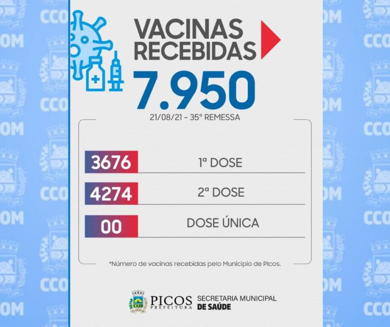 Remessa recebida trouxe 7.950 doses da vacina, sendo 3.676 de 1ª dose, e 4.274 de 2ª dose