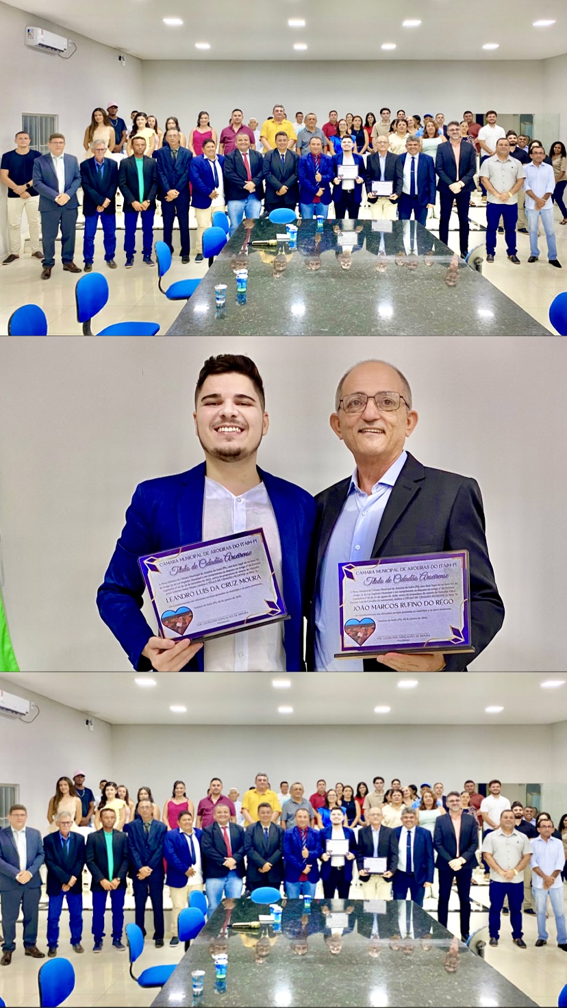Câmara de Aroeiras do Itaim realiza homenagens com Títulos de Cidadania ao jornalista Leandro Cruz e ao servidor João Marcos Rufino