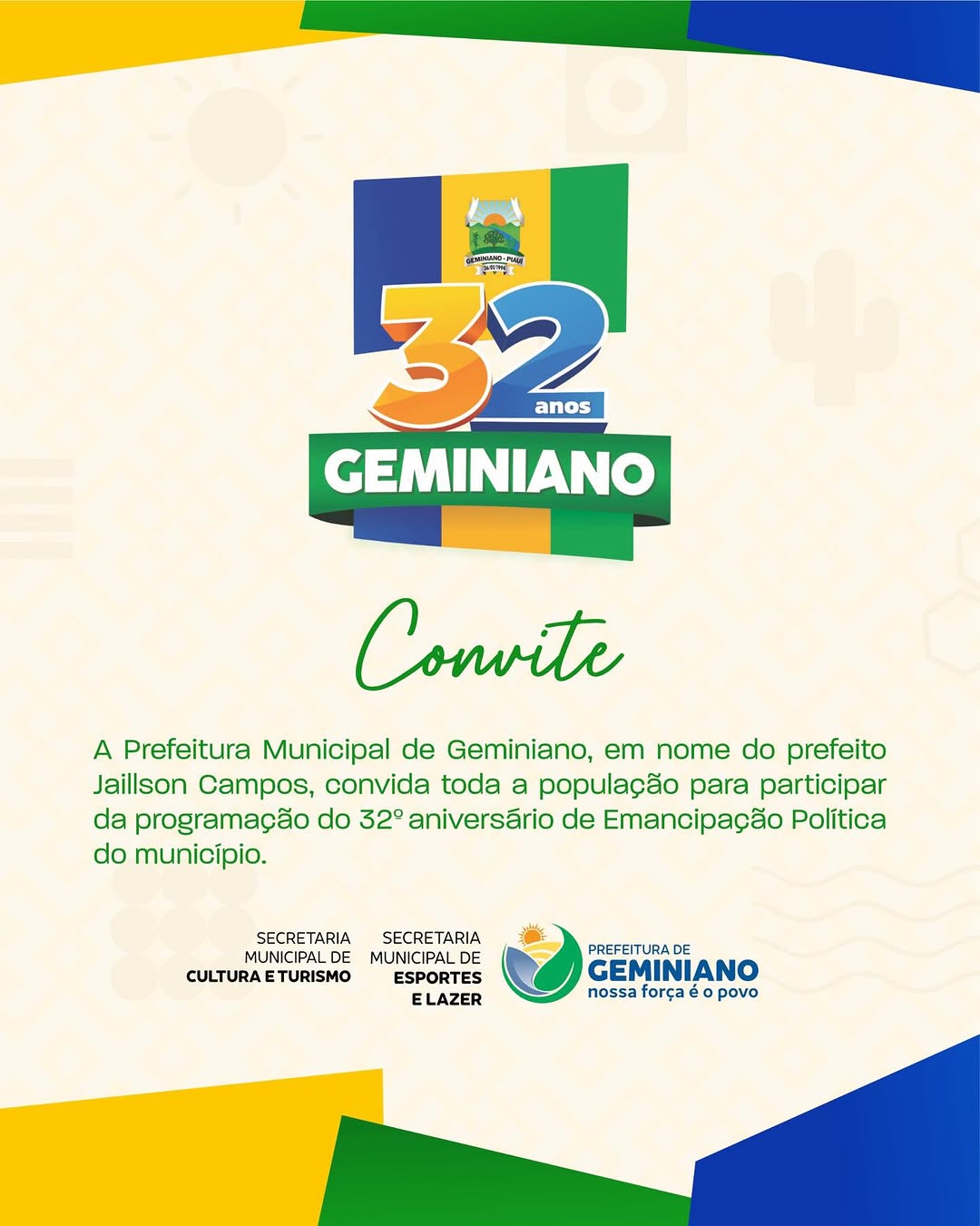 Prefeito de Geminiano, Jaillson Campos, divulga a programação de aniversário dos 32 anos do município