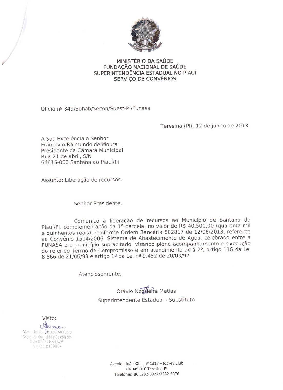 A prefeitura Municipal de Santana do Piauí irá receber da Fundação Nacional de Saúde através da Superintendência Estadual no Piauí uma parcela no valor de R$ 40.500,00 (quarenta mil e quinhentos reais) referentes ao valor do repasse de uma parcela do convênio para a perfuração de um poço tubular na localidade Camarada zona rural do município.