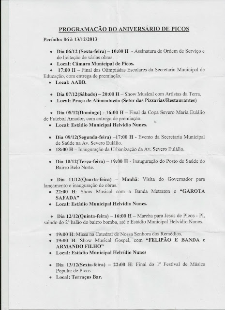 O Prefeito de Picos Kleber Eulálio (PMDB) anunciou na manhã desta quinta-feira (14) na Secretaria Municipal de Cultura Esporte e Lazer a Programação do Aniversário de Picos.