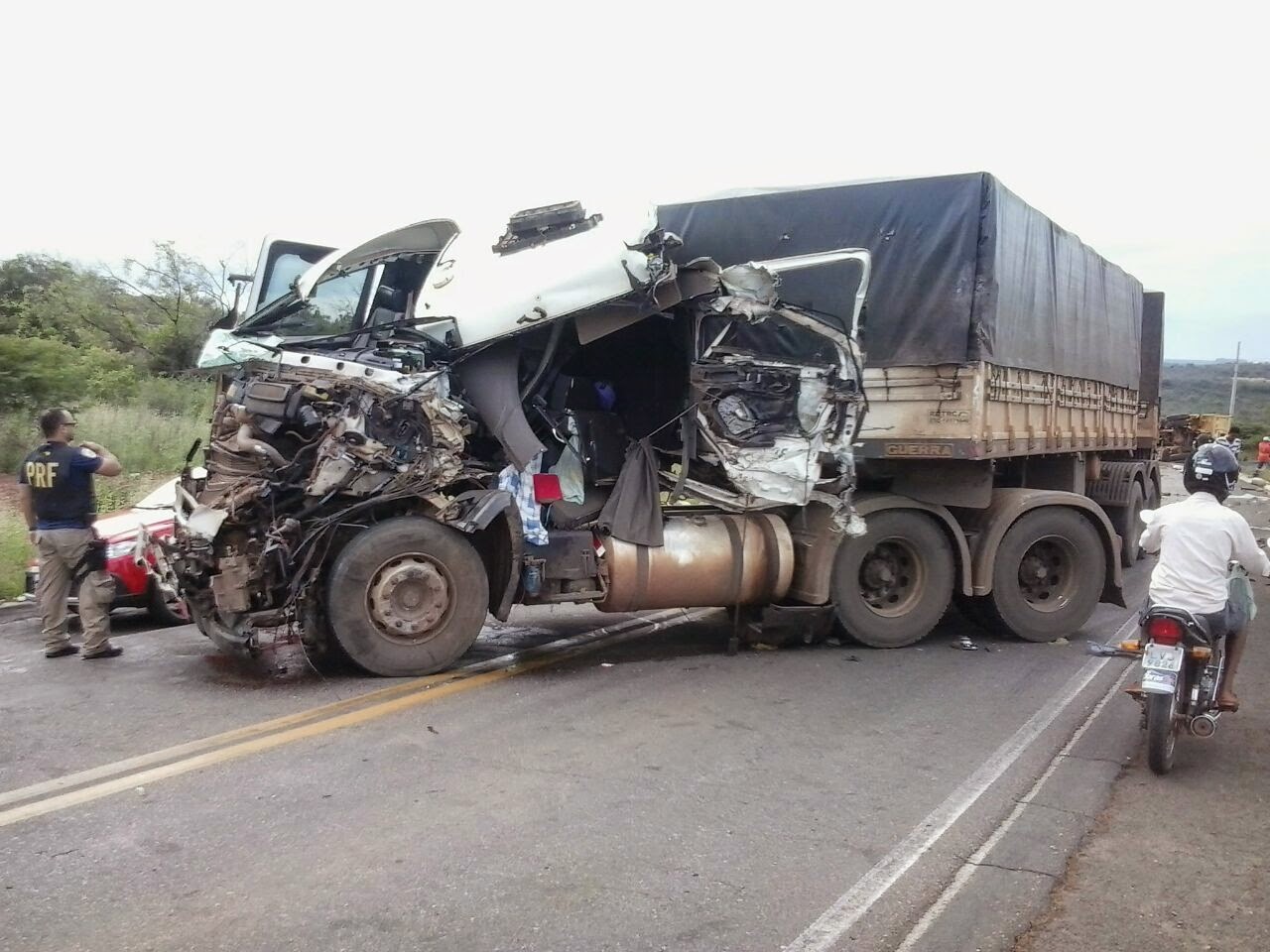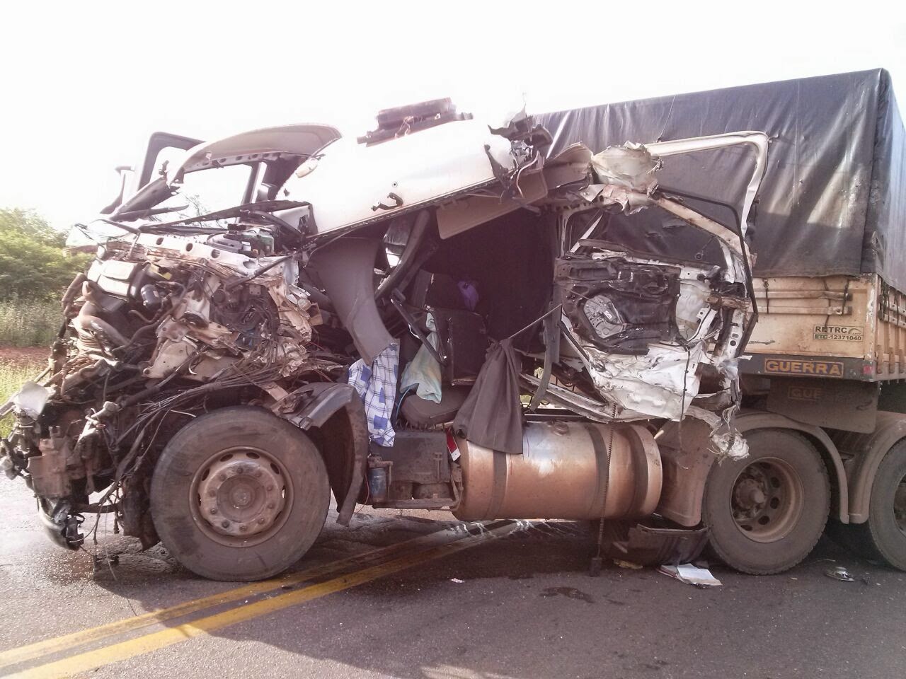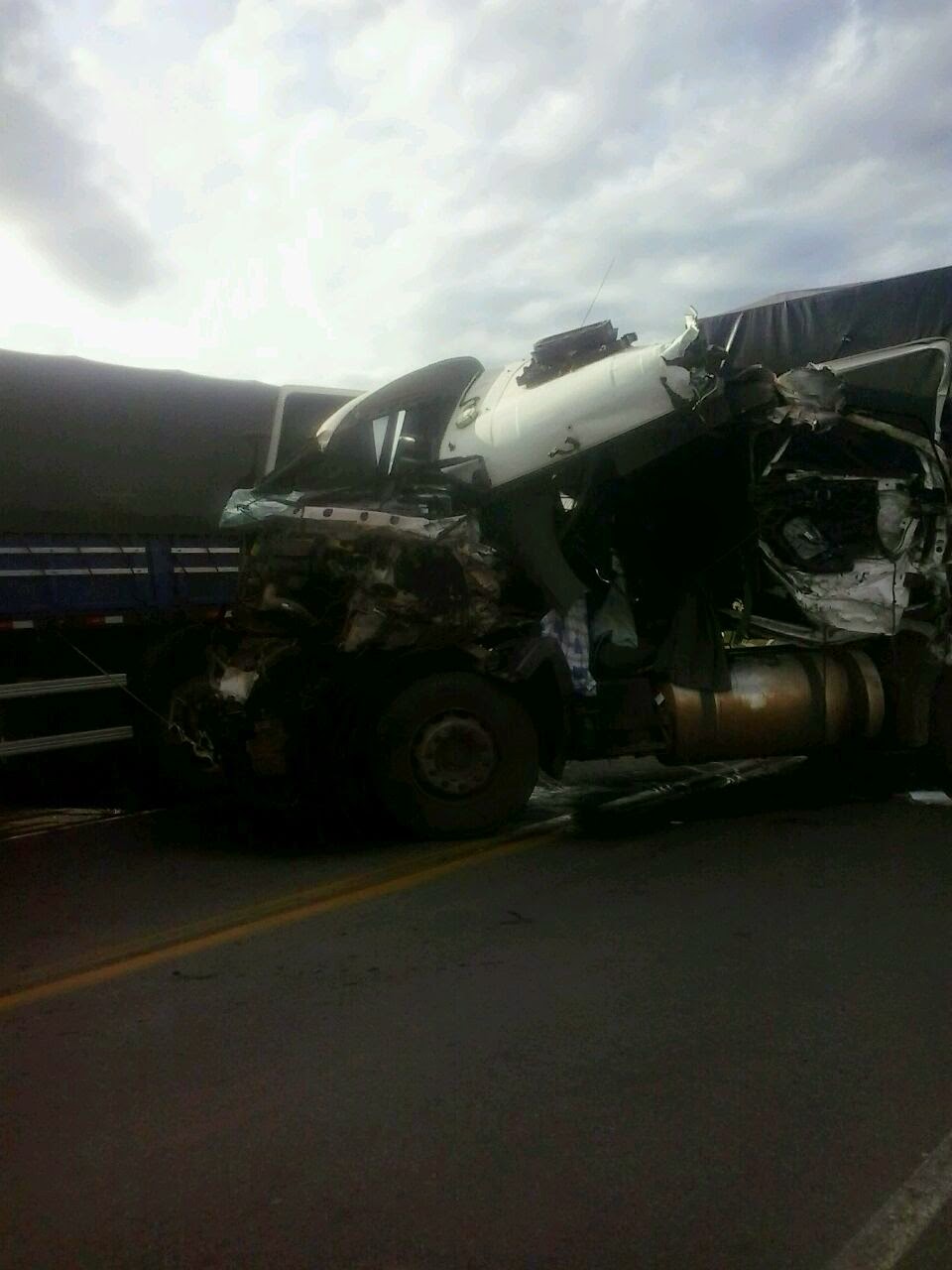 Devido ao acidente, uma das cabines das carretas envolvidas ficou totalmente destruída. Não se sabe até o momento o que motivou a colisão.