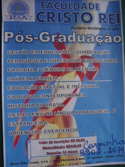 / A Faculdade Cristo Reis de Jaicós irá iniciar várias turmas de Pós-graduação em diversas áreas da educação, o objetivo da instituição é oportunizar professores já graduados mas que ainda não tem uma especialização, e como a faculdade que é credenciada pelo Ministério da Educação pode oferecer, a direção resolveu ampliar o campo na docência educacional.