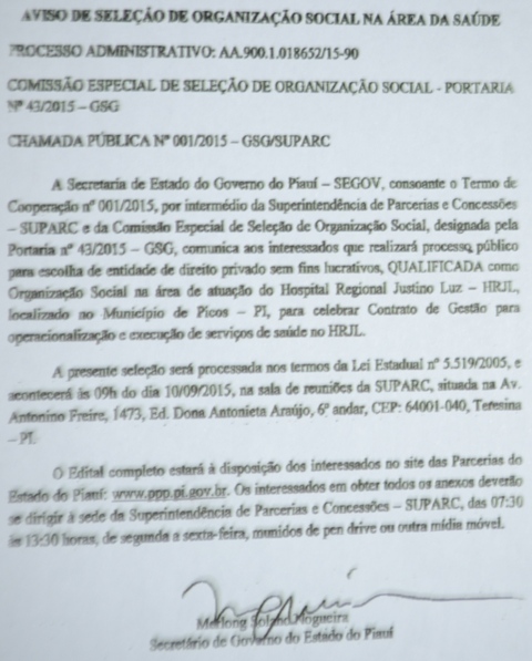 O edital com abertura do processo visando à contratação de uma organização social para administrar a unidade de saúde, foi publicado no Diário Oficial do Estado no último dia 24 de agosto. A seleção da empresa está prevista para o próximo dia 10 de setembro na sede da Superintendência de Parcerias e Concessões, em Teresina.
