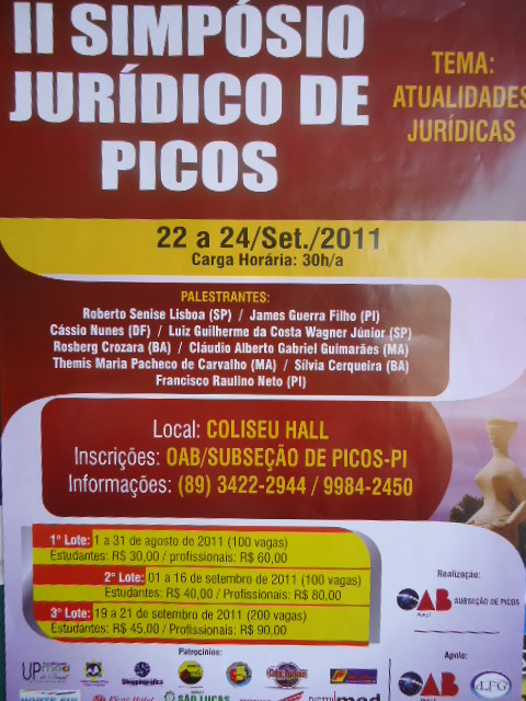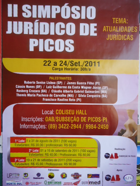 Será realizado no período de 22 a 24 de setembro no Coliseu Hall em Picos, o II Simpósio Jurídico de Picos tendo como realizadora do evento a OAB Subseção de Picos, as inscrições poderão ser feitas na sede da própria OAB no centro ou pelos telefones (89) 3422-2944 e 9984-2450, o 1º lote com 100 vagas disponíveis já foram vendidos ao preço de R$ 30,00 para estudantes e R$ 60,00 para profissionais no período de 01 a 31 de agosto passado.