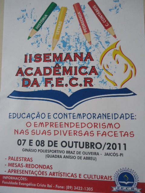 Comerá na noite desta sexta-feira (07/10), na Faculdade Evangélica Cristo Rei em Jaicós a II Semana Acadêmica que tem como tema "Educação e Contemporaneidade: O Empreendedorismo nas suas Diversas Facetas". A Semana Acadêmica vai de hoje até amanhã sábado (08) que acontecerá no Ginásio Poliesportivo Braz de Oliveira com uma vasta programação.