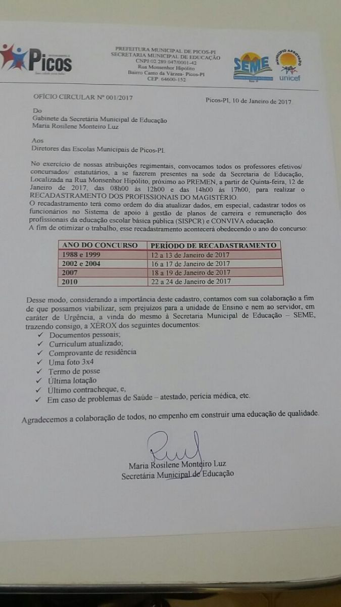 Desta forma, a Secretaria Municipal de Educação de Picos também já anunciou que irá começar a partir do dia 12 e vai até o dia 24 o recadastramento de todos os servidores, inclusive todos os professores, a primeira chamada para fazer o recadastramento que vai ocorrer na sede da própria secretaria na Rua Monsenhor Hipólito que será nos dois horários, será os concursados de 1988 e 1999 que acontecerão no período de 12 a 13 de janeiro de 2017.