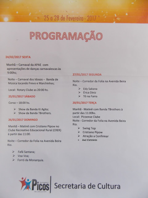 O Prefeito Pe. Walmir Lima (PT) anunciou hoje (25), a programação oficial do carnaval deste ano, a novidade é que o Picosfolia seja realizado na Av. Beira Rio ao lado do centro da cidade.