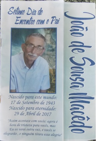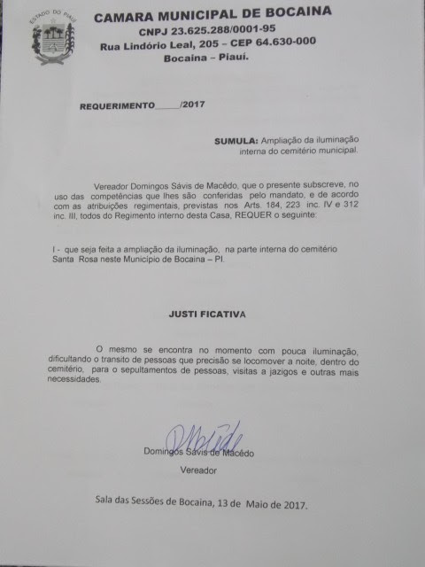 O Vereador Domingos Macedo iniciou sua fala parabenizando o Dia das Mães a todas as mães, informando que não existem palavras para representar tudo que essa pessoa representada para todos. Ele também apresentou um requerimento no qual solicita do executivo que seja feita a ampliação da iluminação do cemitério Santa Rosa, pois ele tendo que acompanhar o funeral do seu tio que ocorreu a noite percebeu que há a necessidade de se melhorar a fonte de luz do local. Na oportunidade o edil apresentou uma moção de pesar direcionada ao seu tio João de Sousa Macedo que residia no Morro do Peru naquele município.
