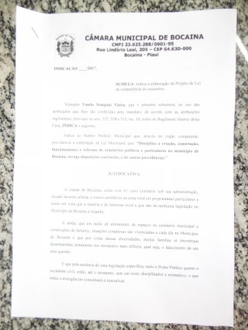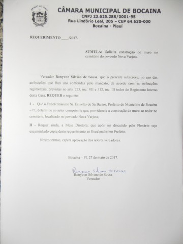 “Venho através desse requerimento solicitar do Excelentíssimo Prefeito, que ele coloque os redutores de velocidade no povoado em virtude do grande tráfego de veículos que existe e que vez ou outra faz com que aconteçam acidentes pela alta velocidade que circulam no local trazendo insegurança e até mesmo perigo para os moradores. E quanto ao cemitério é necessário a reconstrução do muro, pois, estão entrando animais e podem estes danificar os túmulos e também pela própria questão da necessidade de se murar já que ele fica na parte central do povoado”, disse.