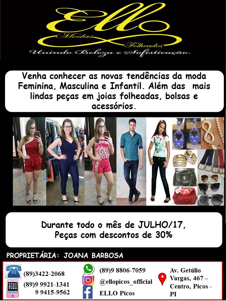 Na Ello Modas e Folheados o consumidor ainda dispõe de joias folheadas além de bolsas e acessórios. A Ello Modas e Folheados fica localizada na Avenida Getúlio Vargas, 467 no Centro da cidade de Picos.