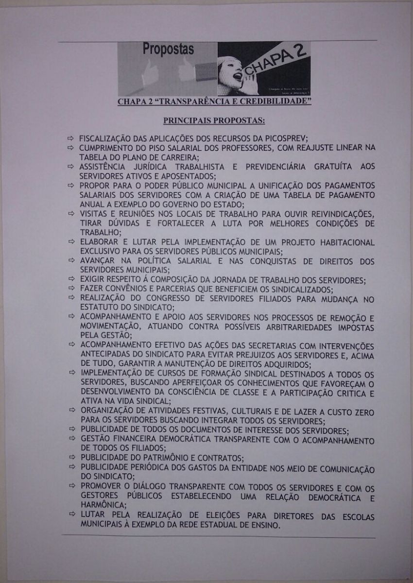 Com o nome inscrito na chapa como “Transparência e Credibilidade” a Chapa – 2 que concorre as eleições Sindserm no dia (17) de janeiro próximo expõem para os filiados o que pensam caso cheguem a presidência.