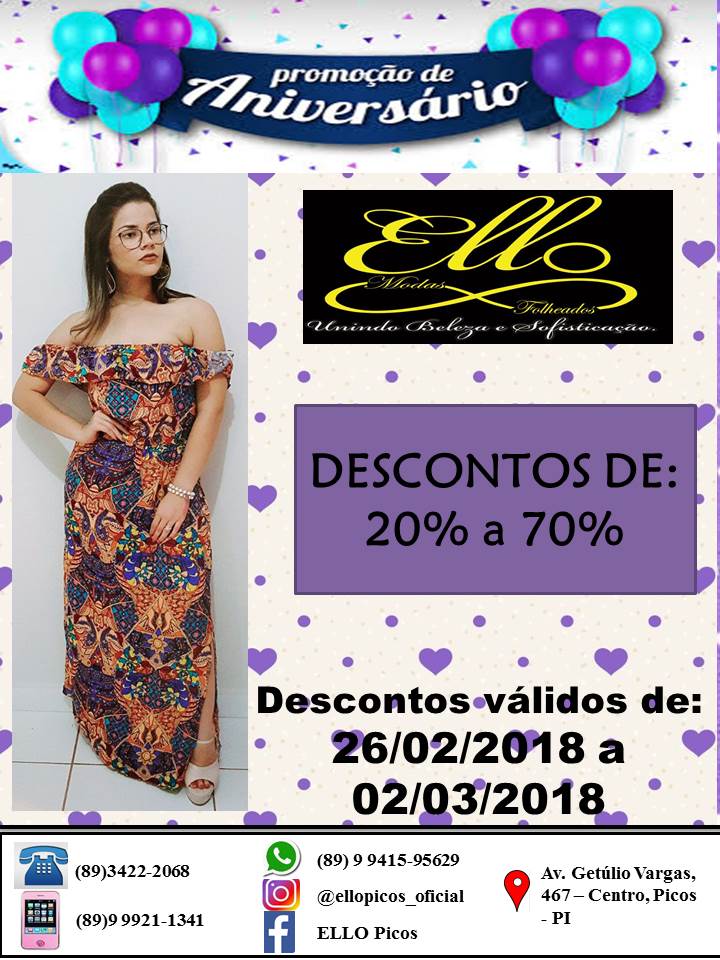 A promoção de aniversário da Ello Modas e Folheados vai até acabar o estoque. Corra e faça as suas compras de aniversários pagando pouco com preços promocionais. A promoção de aniversário que começou ontem e vai até o dia (02) de março, pois serão cinco dias de muitos descontos.