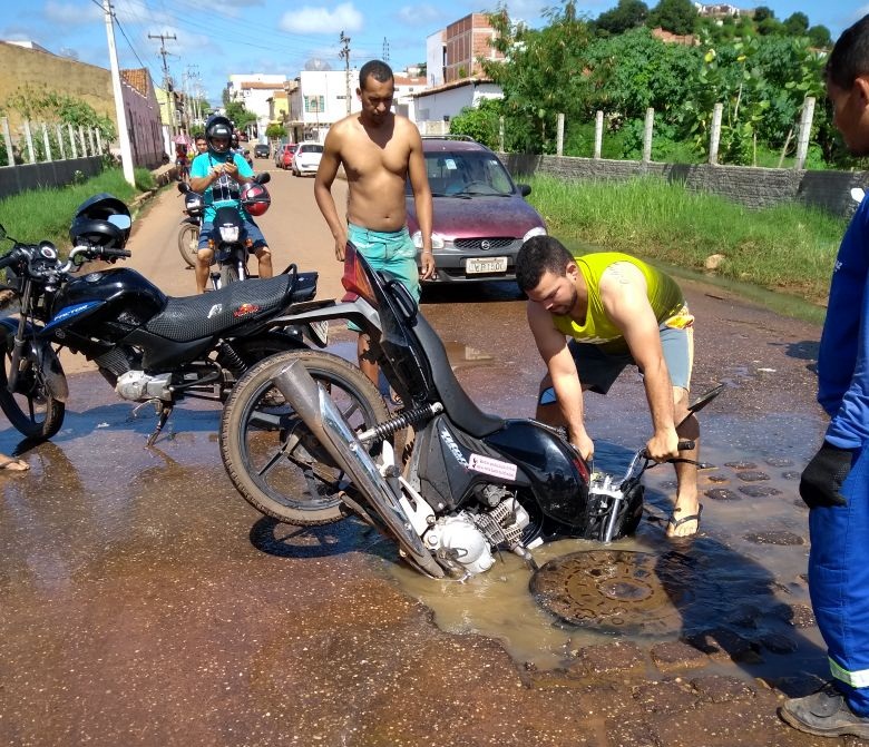 Uma moto caiu em um buraco na rua Cel. Luiz Nunes no bairro são José em Picos na manhã desta segunda-feira, 05, dando um verdadeiro susto no motoqueiro que conduzia o veículo.