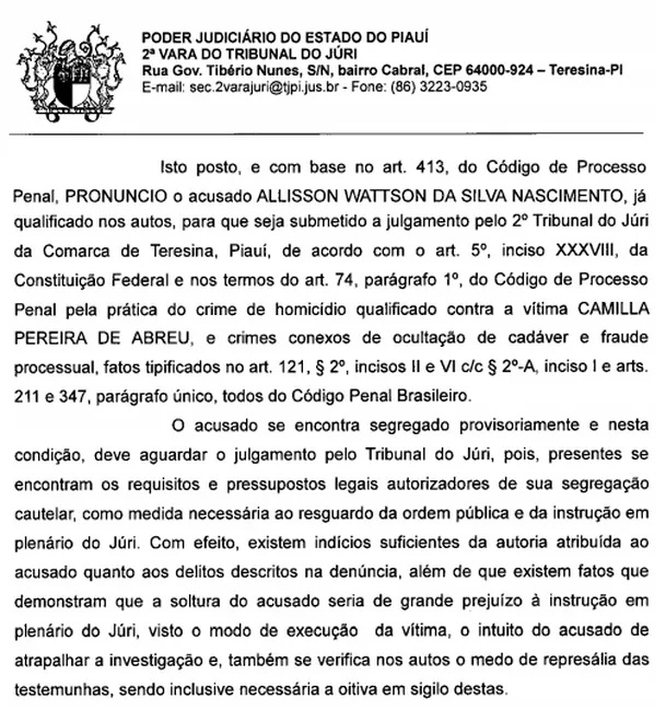 O ex-policial militar Allison Wattson da Silva Nascimento acusado de matar a namorada, a estudante Camila Abreum, vai à Júri Popular. Na decisão, divulgada nessa terça-feira (3), a juíza Maria Zilnar Coutinho Leal, da 2ª Vara do Tribunal do Júri, pronunciou o réu pelos crimes de homicídio qualificado, ocultação de cadáver e fraude processual. A vítima foi morta com um tiro na cabeça em outubro de 2017.