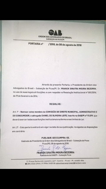 A Ordem dos Advogados do Brasil, Subsecção de Picos/PI deu posse nesta quinta-feira (09) na Comissão de Direito Municipal, Administrativo e do Consumidor o novo membro da comissão, o advogado Dr. Daniel de Oliveira Leite.