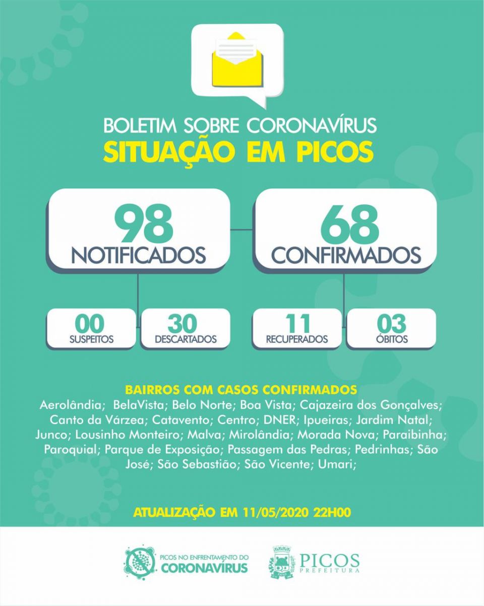 A Secretaria Municipal de Saúde de Picos divulgou na noite desta segunda-feira (11), o boletim informativo dos casos de coronavírus no município, e de acordo com o novo levantamento nas últimas 24 horas foram registrados mais 09 casos de Covid-19, fazendo assim um total de 68 casos confirmados, além de 98 notificações e nenhum caso suspeito.