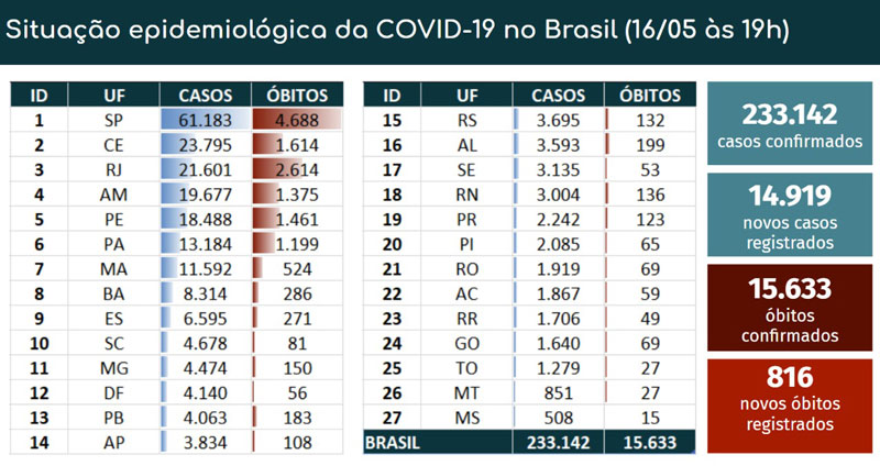 O balanço do Ministério da Saúde divulgado nesta sexta-feira (15) informa 14.817 mortos e 218.223 casos.