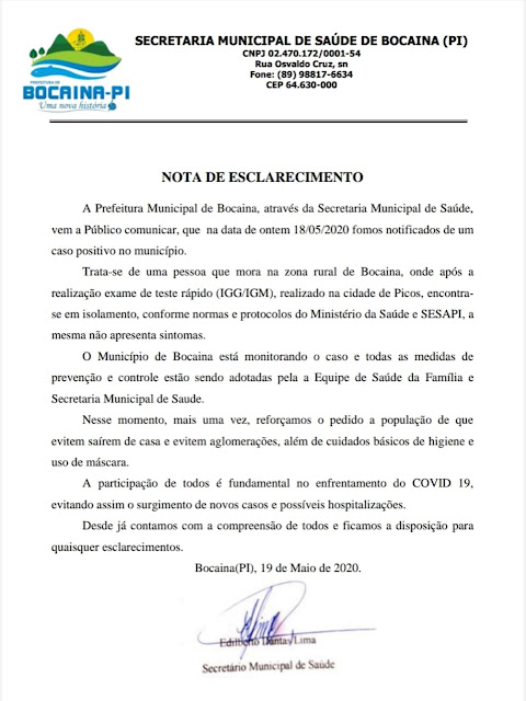 A Prefeitura Municipal de Bocaina, através da Secretaria Municipal de Saúde, publicou na manhã desta terça-feira, 19, uma nota de esclarecimento sobre o primeiro caso confirmado de Covid-19 do município.