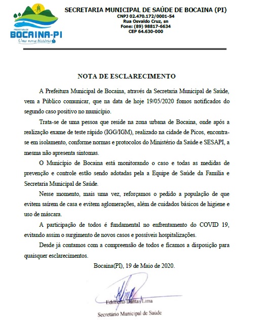A Prefeitura de Bocaina confirmou através de uma nova Nota de Esclarecimento na tarde desta terça-feira, 19, o segundo caso de Corona Vírus no município.