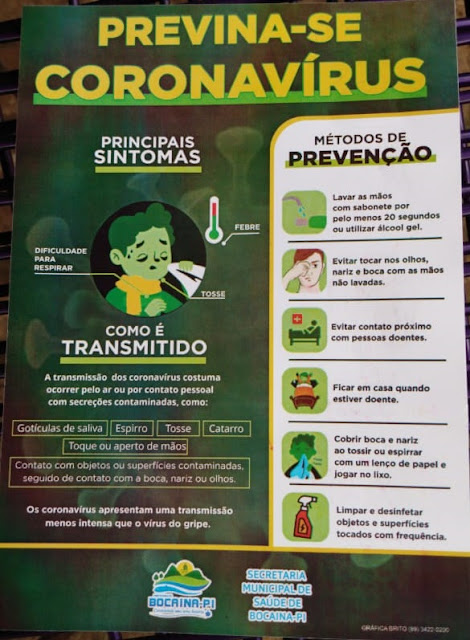 Medidas preventivas já estão sendo realizadas em Bocaina, como a distribuição de máscaras e álcool gel, dedetização de locais públicos, distribuição de panfletos informativos, disponibilização de totens com álcool gel nos principais pontos da cidade, disponibilização de tendas nos locais de recebimento do auxílio emergências, dentre outras.