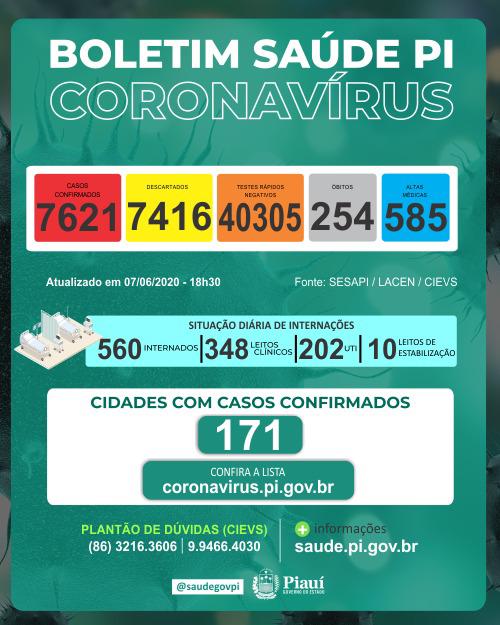 O Piauí alcançou as marcas de 254 mortes e 7.621 casos confirmados do novo coronavírus, segundo dados da Secretaria de Estado da Saúde do Piauí (Sesapi) divulgados na noite deste domingo (7).