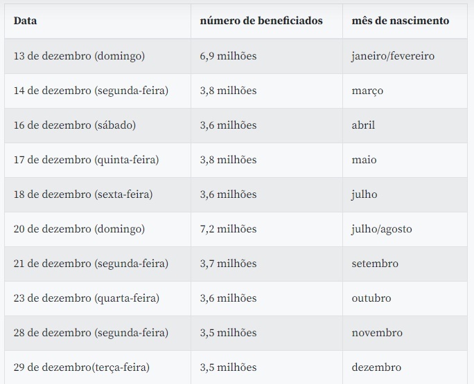 Os calendário de crédito em poupança digital prossegue no ciclo 5, que começa a partir do dia 22 de novembro (nascidos em janeiro) e vai até 12 de dezembro (nascidos em dezembro). O último ciclo de pagamentos (ciclo 6) começa em 13 de dezembro (nascidos em janeiro) e vai até o dia 29/dezembro (nascidos em dezembro). Veja nas tabelas: