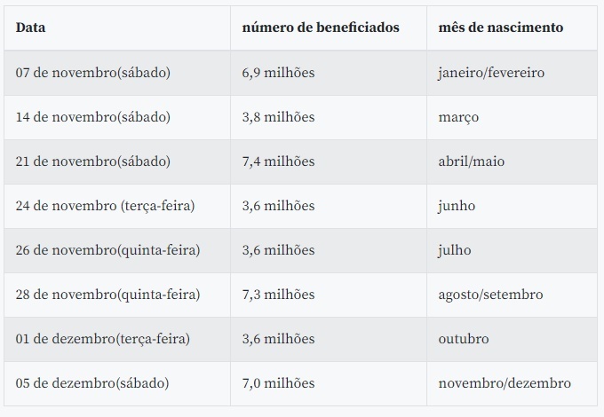 Para o beneficiário que optar pelo saque em dinheiro ou transferência bancária, o governo elaborou um calendário específico, que começa do dia 7 de novembro (nascidos em janeiro) e vai até 5 de dezembro (nascidos em dezembro), válidos para os ciclos 3 e 4. Confira: