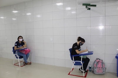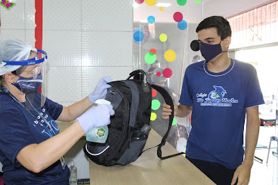 Logo na chegada às 07:00H, os alunos eram verificados a temperatura corporal, tapete sanitizante para limpar os calçados, uso de álcool em gel, máscara e já dentro da escola as mochilas também eram sanitizadas, uma forma também de proteção. Em seguida os alunos se dirigiam para as salas de aulas que já estavam todas adaptadas com espaçamento de dois metros de uma carteira para outra, além de um controle rigoroso durante toda aula.