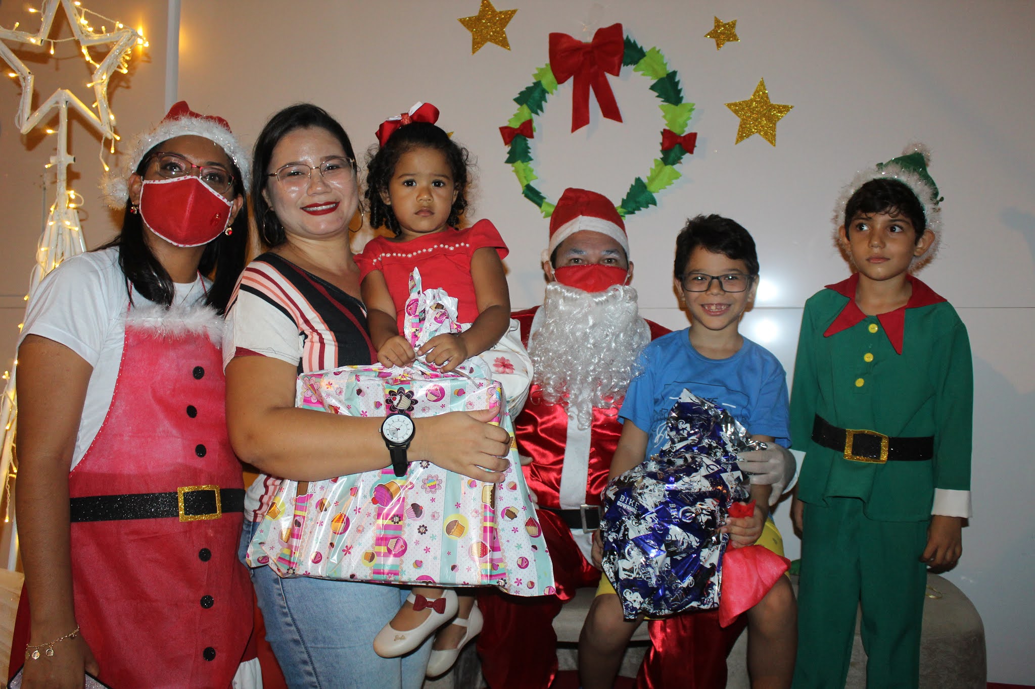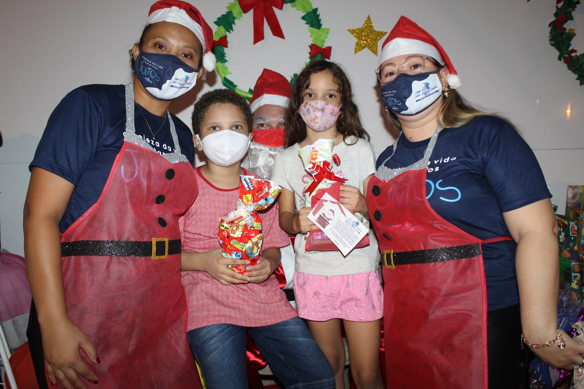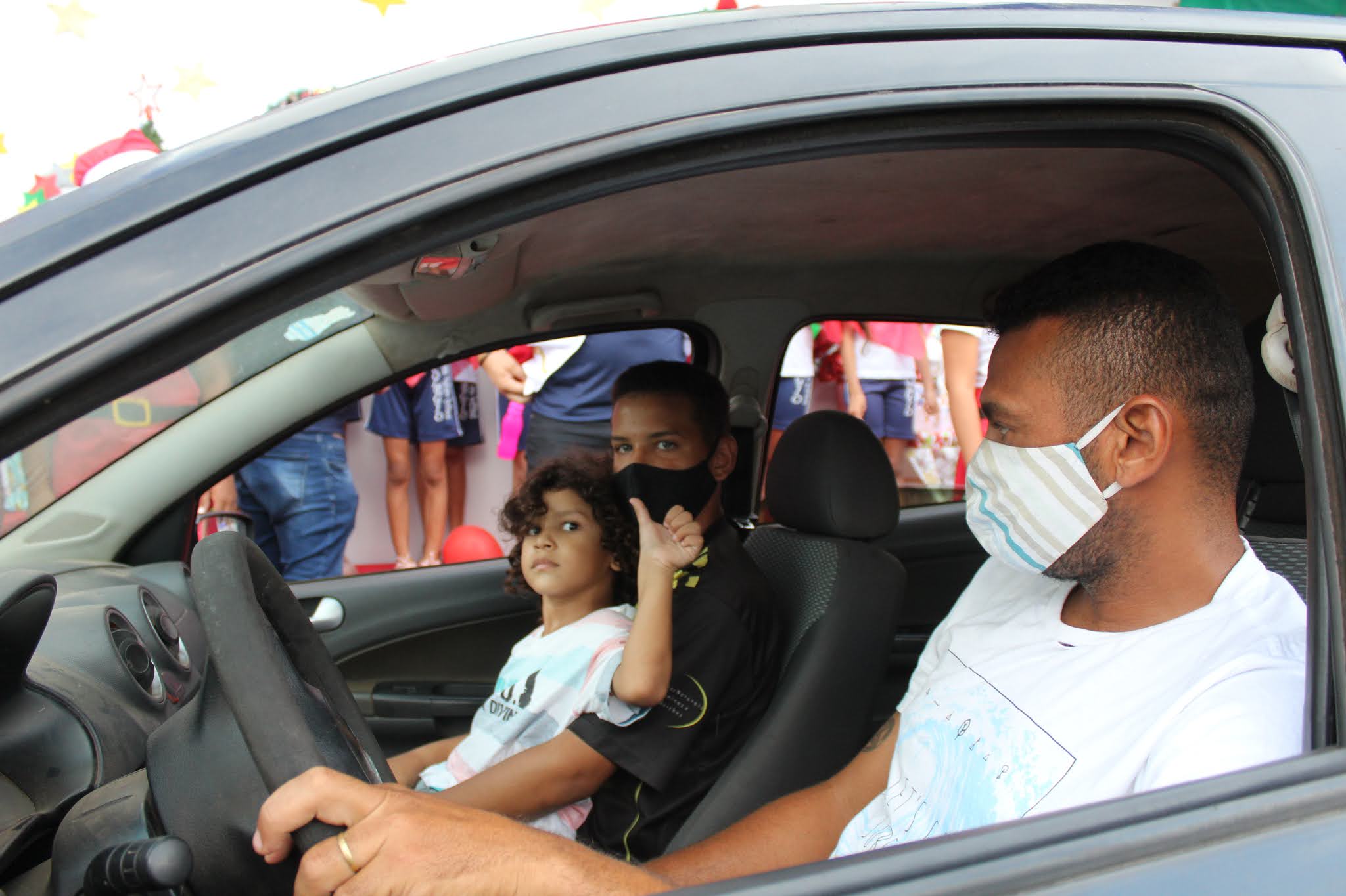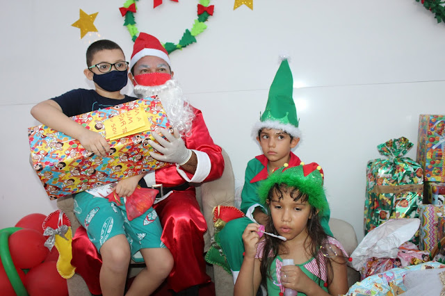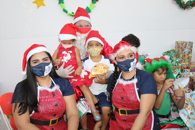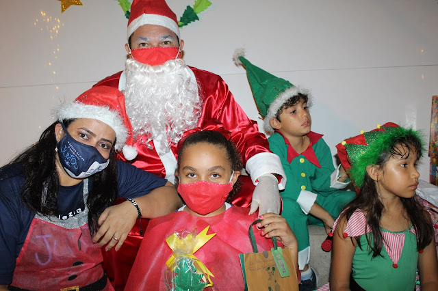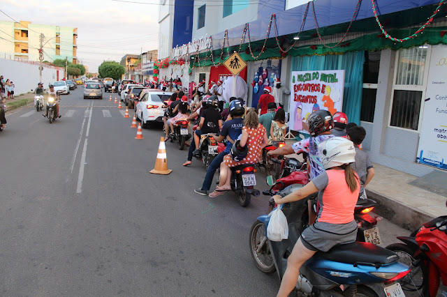 Os pais levaram os alunos até a escola de carro e moto, eles deram uma paradinha rápida na porta do colégio, aproveitaram para tirar umas fotos e teve até lembrancinha dos professores, e entrega de presentes pelo Papai Noel para os alunos com o apoio e participação das famílias.
