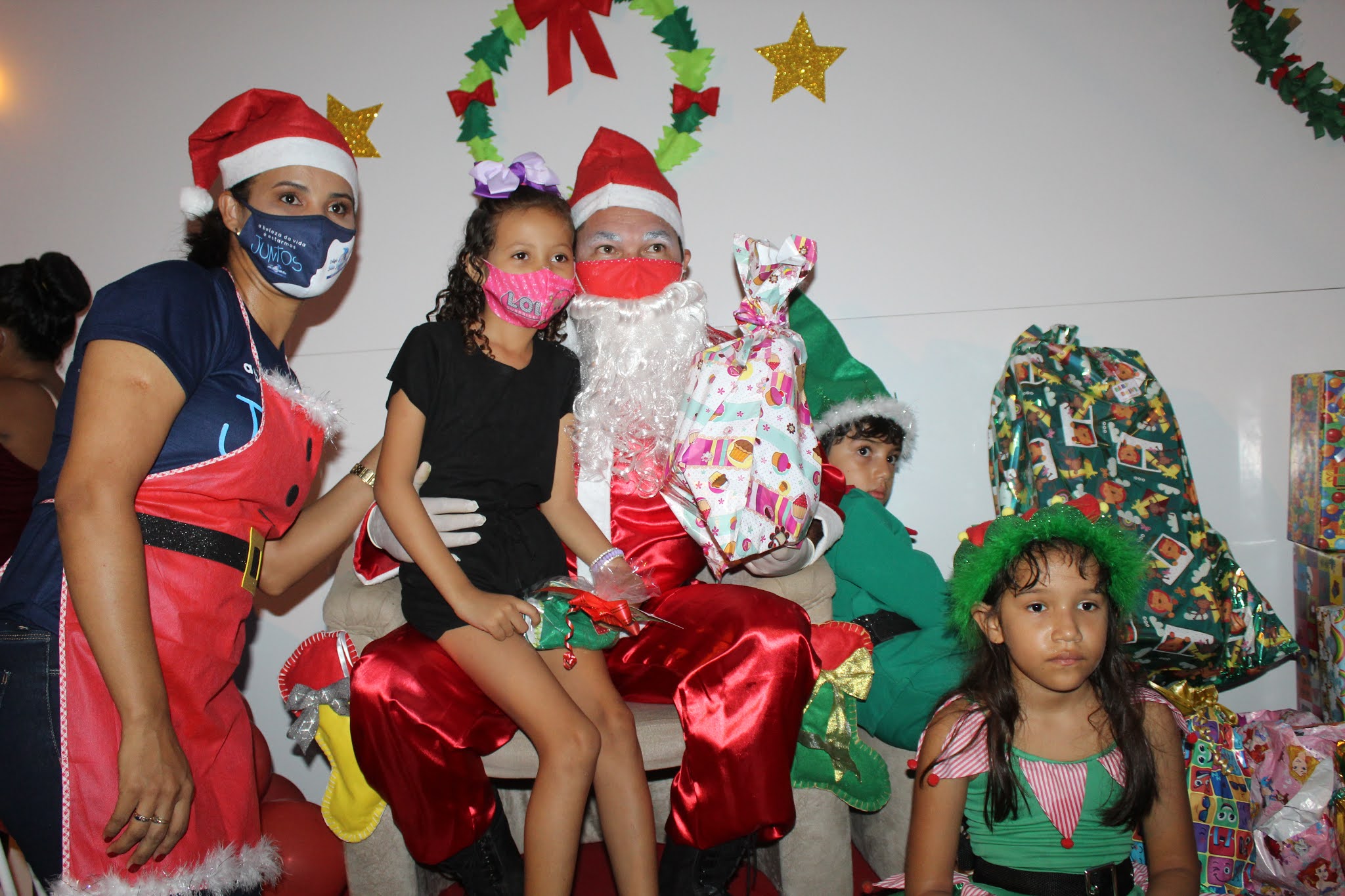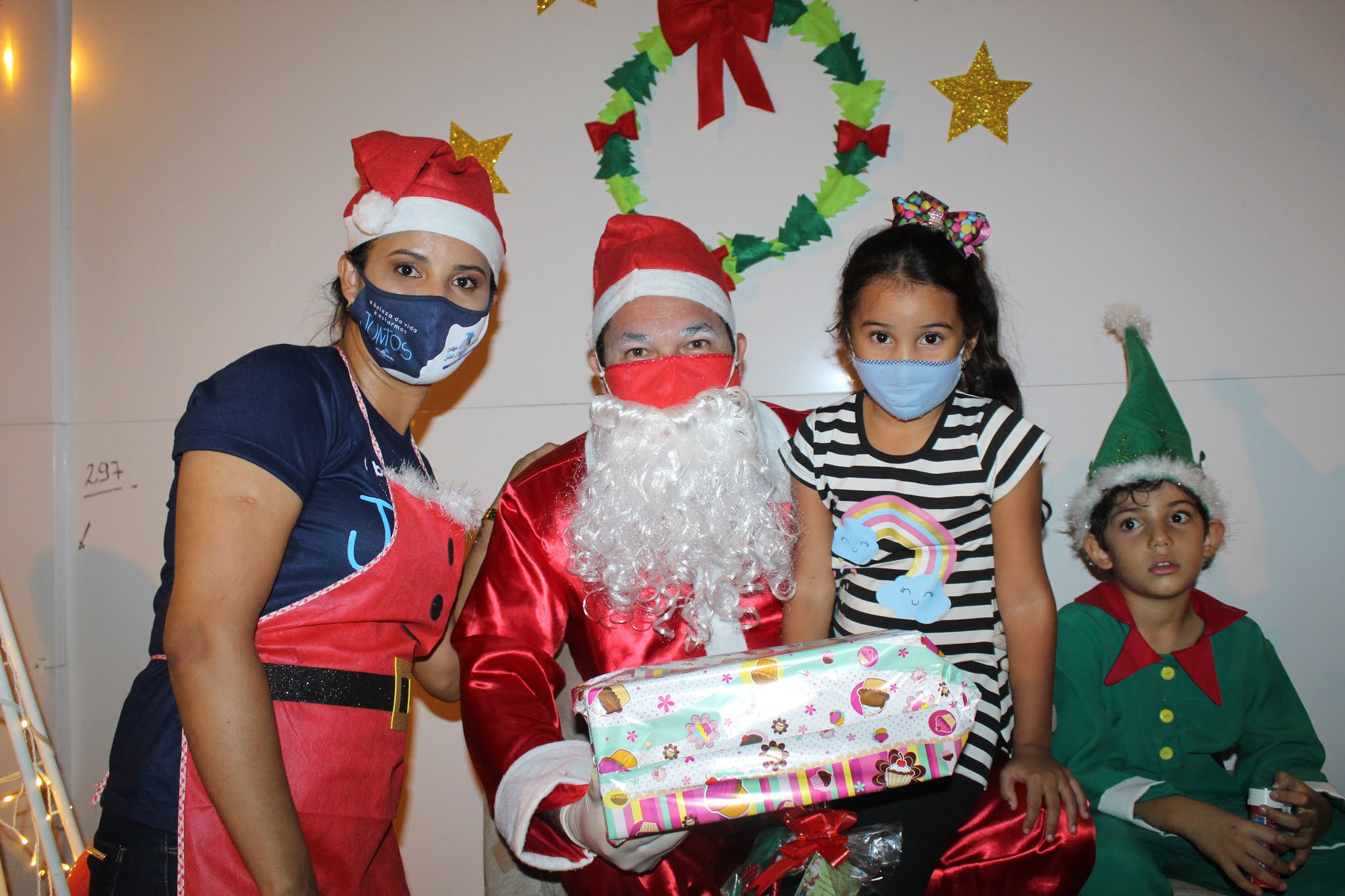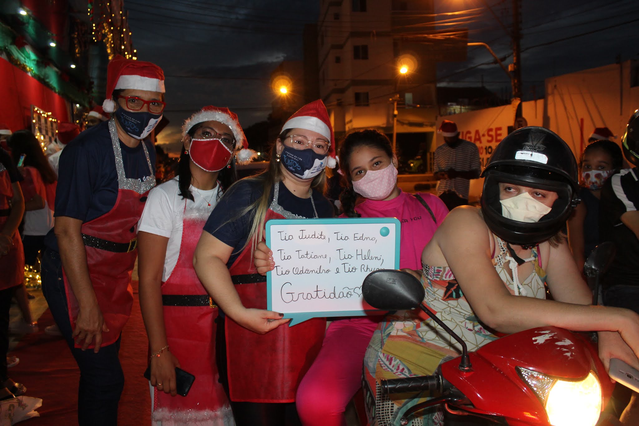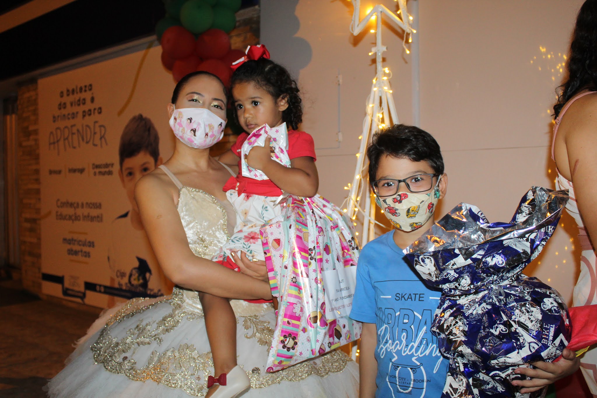 Os pais levaram os alunos até a escola de carro e moto, eles deram uma paradinha rápida na porta do colégio, aproveitaram para tirar umas fotos e teve até lembrancinha dos professores, e entrega de presentes pelo Papai Noel para os alunos com o apoio e participação das famílias.