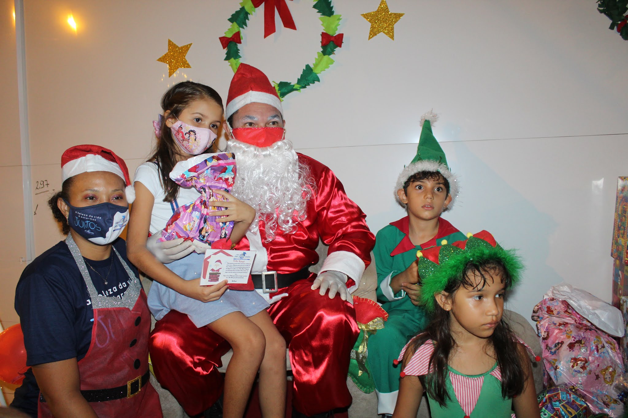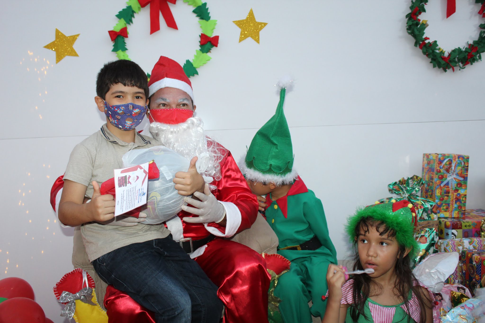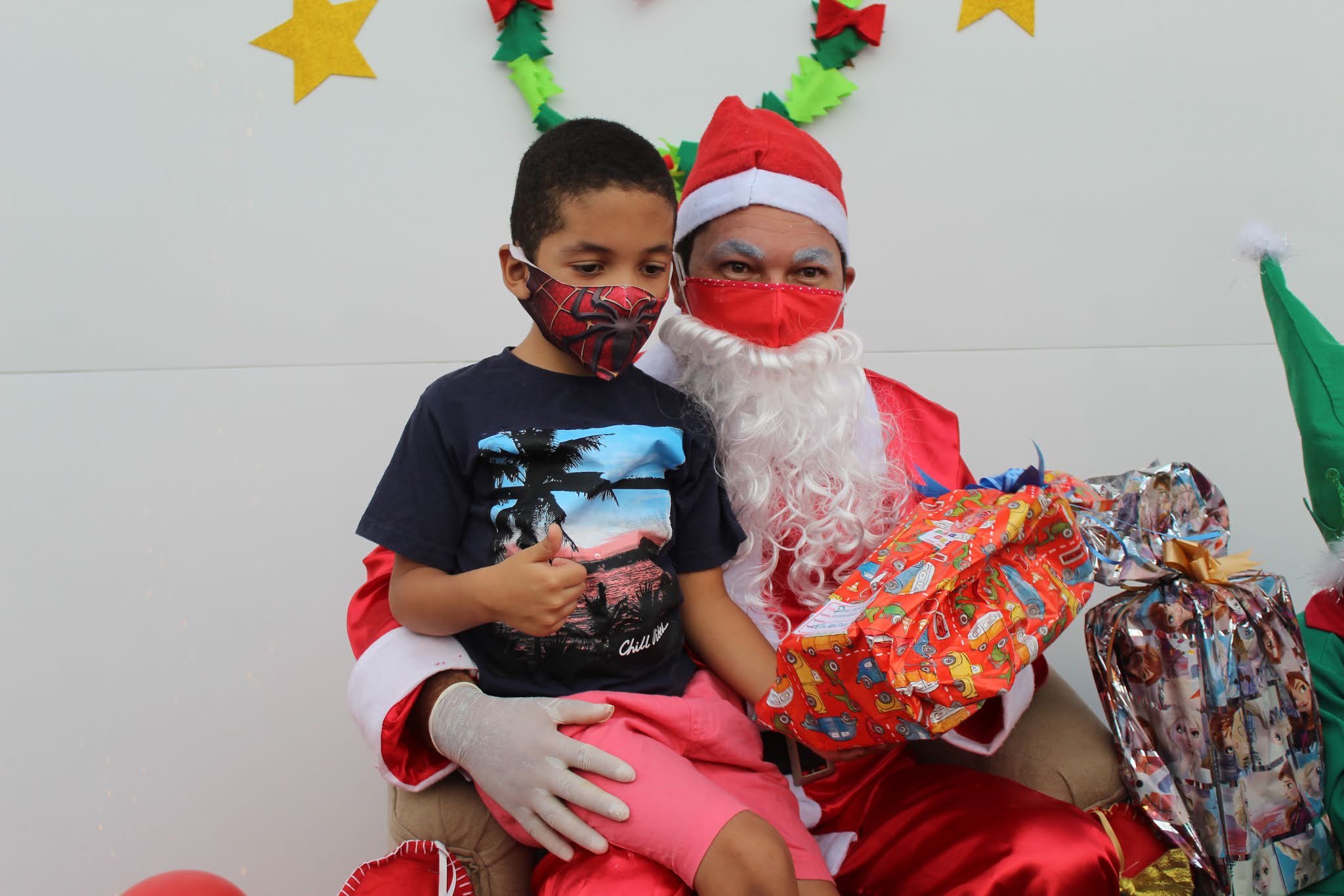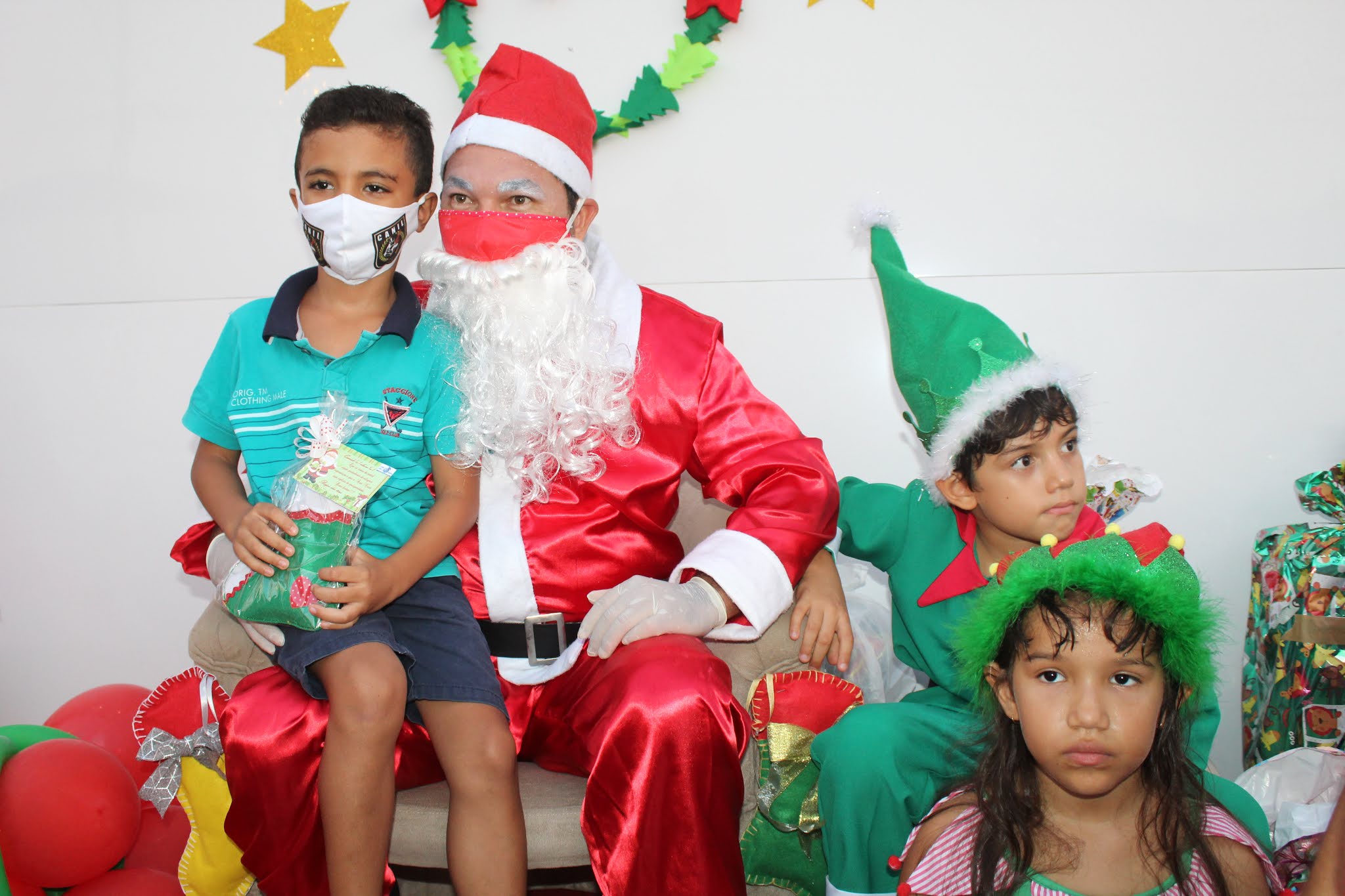 Os pais levaram os alunos até a escola de carro e moto, eles deram uma paradinha rápida na porta do colégio, aproveitaram para tirar umas fotos e teve até lembrancinha dos professores, e entrega de presentes pelo Papai Noel para os alunos com o apoio e participação das famílias.