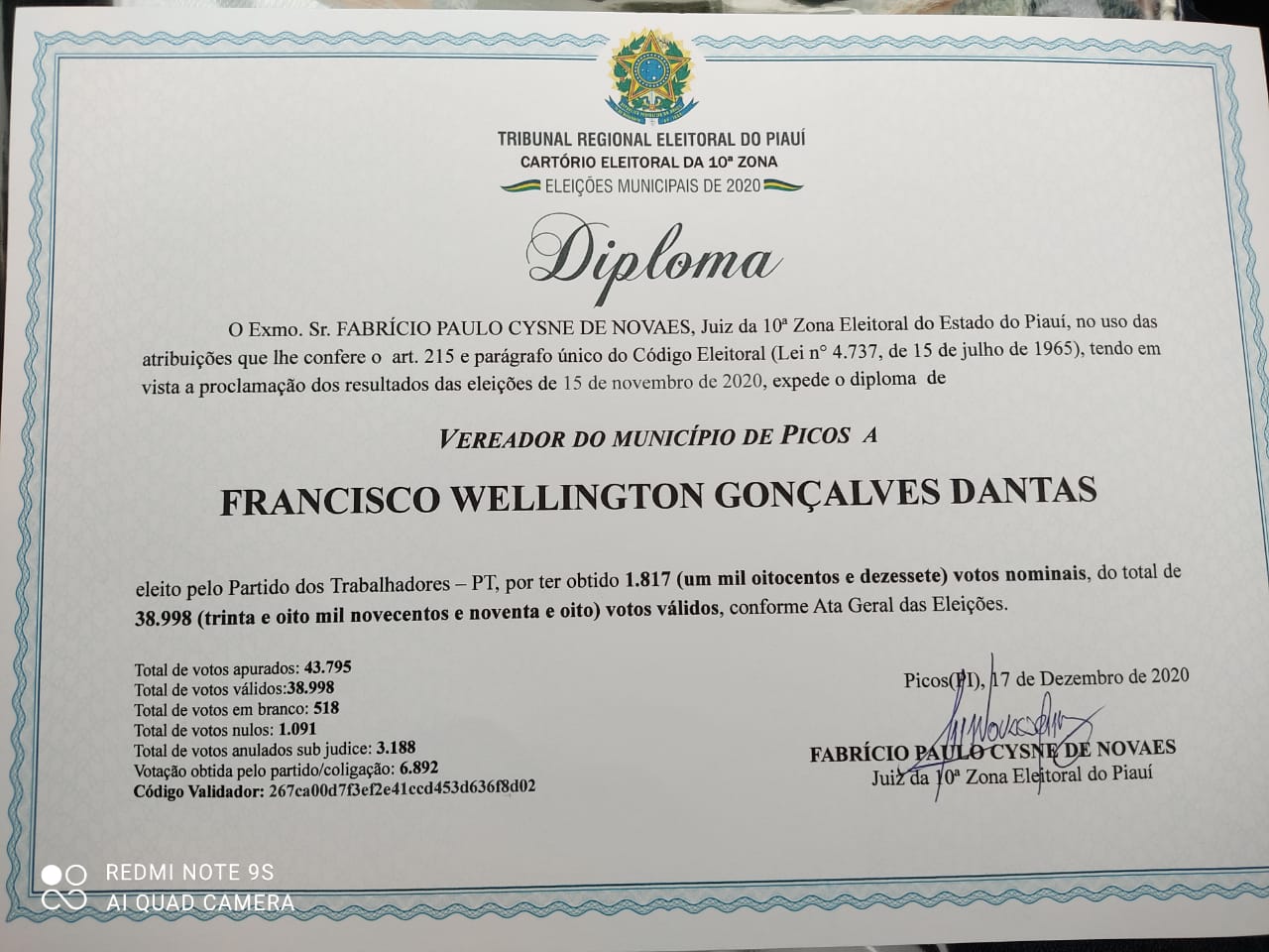 Obedecendo as regradas determinadas pela justiça eleitoral, o juiz titular da 10ª Zona Eleitoral do Piauí, Dr. Fabrício Paulo Cysne de Novaes, em horário estabelecido, diplomou na manhã desta quinta-feira (17), o vereador Wellington Dantas (PT), que foi reeleito com 1.817 votos na última eleição municipal do dia, 15, de novembro de 2020.