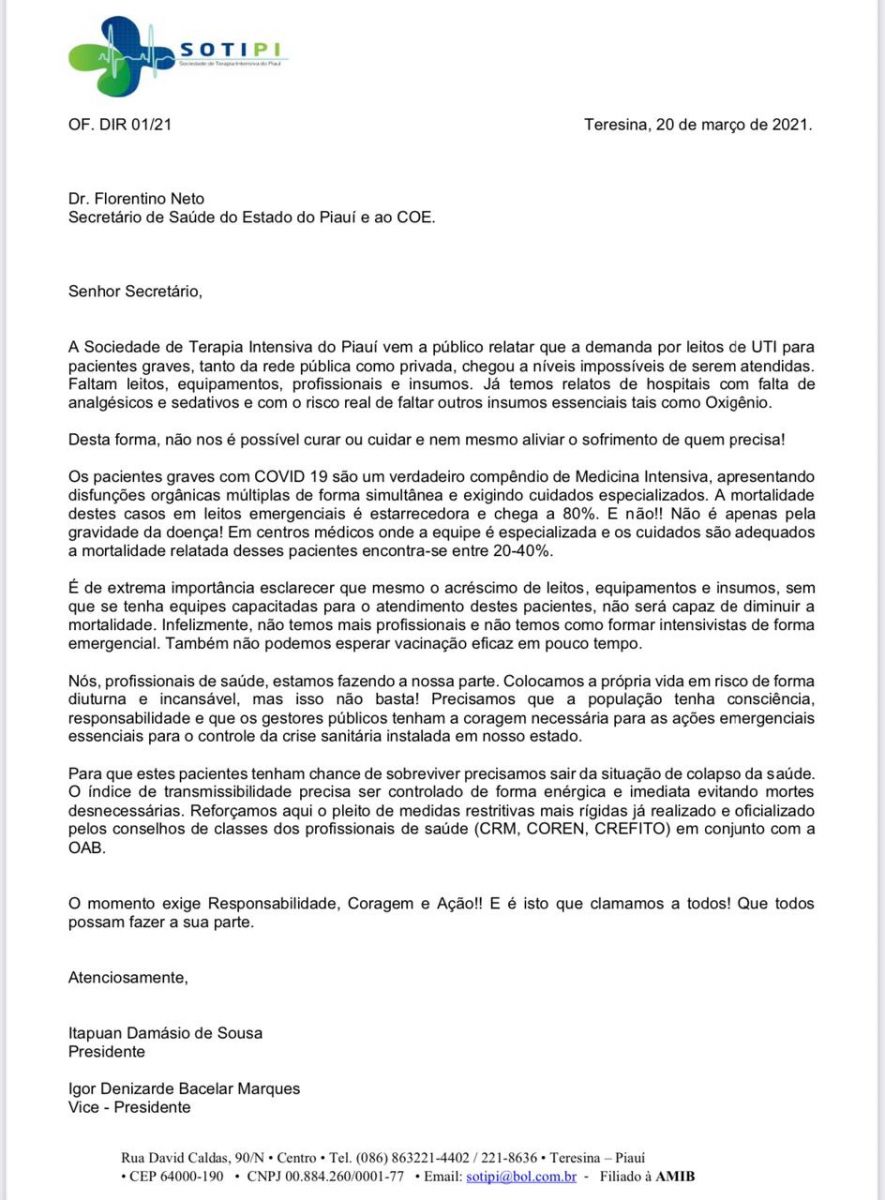 A Sociedade de Terapia Intensiva do Piauí se dirigiu ao Secretário de Saúde do Estado, Florentino Neto, exigindo responsabilidade, coragem e ação. O documento enviado hoje ao Secretário ressalta que a demanda por leitos de UTI para pacientes graves, tanto da rede pública como privada, chegou a níveis impossíveis de serem atendidos. “Faltam leitos, equipamentos, profissionais e insumos. Já temos relatos de hospitais com falta de analgésicos e sedativos e com o risco real de faltar outros insumos essenciais tais como Oxigênio”, diz o documento.