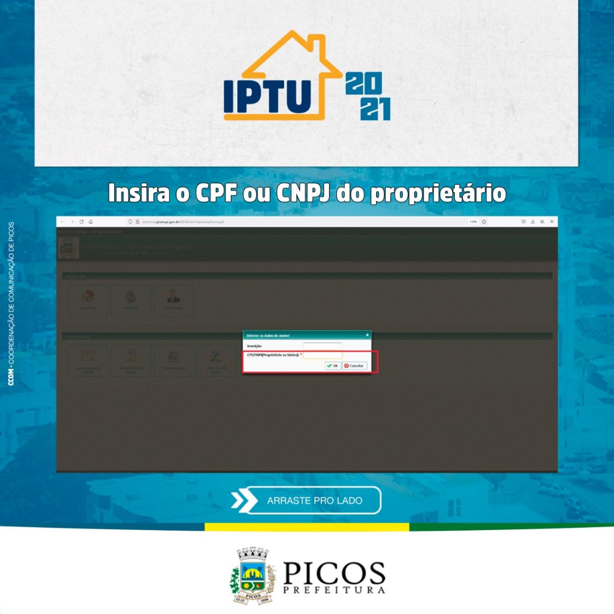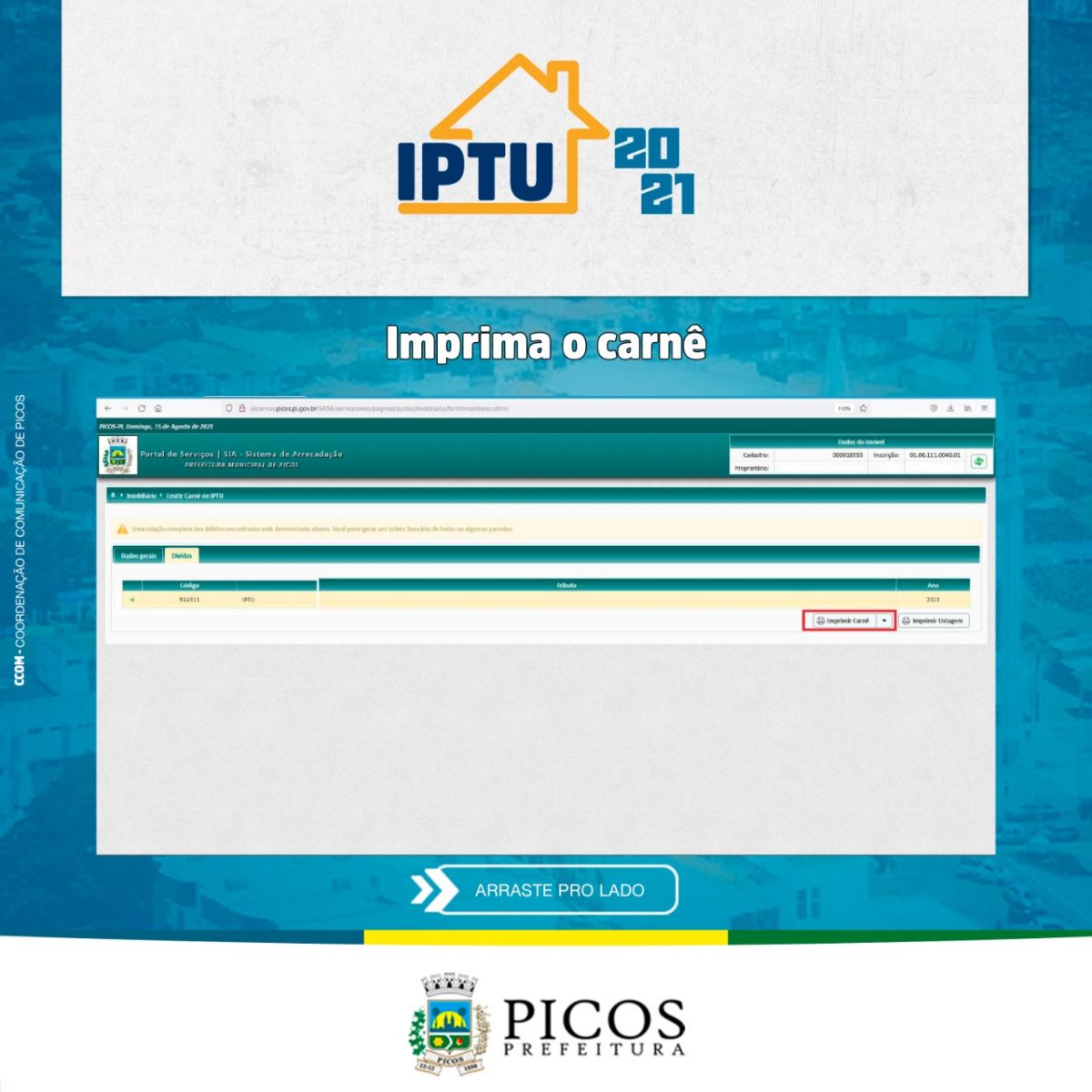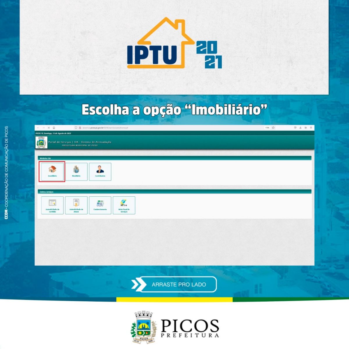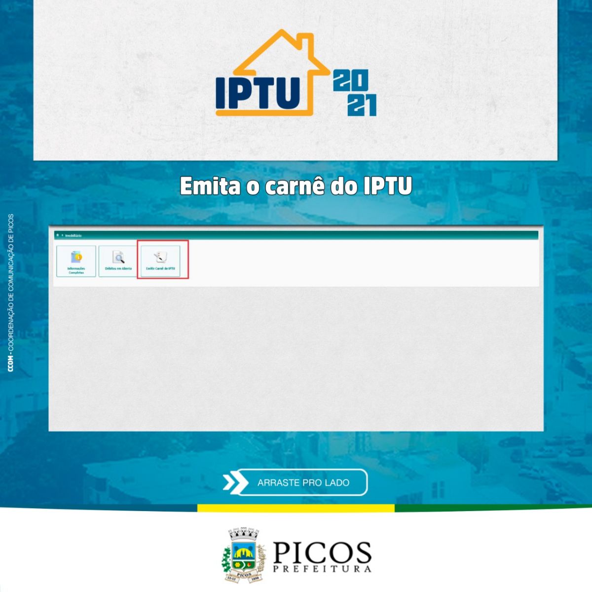 Os contribuintes que não receberam o IPTU/2021 dos seus imóveis ou necessitarem de realizar atualização cadastral devem procurar a Secretaria Municipal de Finanças. Para realizar a emissão dos boletos de IPTU o contribuinte deve acessar a página da Prefeitura Municipal de Picos neste endereço eletrônico www2.picos.pi.gov.br e seguir o passo a passo, como o ilustrado abaixo.