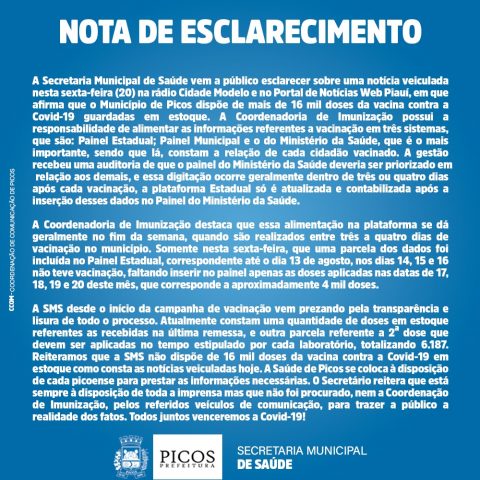A SMS desde o início da campanha de vacinação vem prezando pela transparência e lisura de todo o processo. Atualmente constam uma quantidade de doses em estoque referentes as recebidas na última remessa, e outra parcela referente a 2ª dose que devem ser aplicadas no tempo estipulado por cada laboratório, totalizando 6.187. Reiteramos que a SMS não dispõe de 16 mil doses da vacina contra a Covid-19 em estoque como consta as notícias veiculadas hoje. A Saúde de Picos se coloca à disposição de cada picoense para prestar as informações necessárias. O Secretário reitera que está sempre à disposição de toda a imprensa mas que não foi procurado, nem a Coordenação de Imunização, pelos referidos veículos de comunicação, para trazer a público a realidade dos fatos. Todos juntos venceremos a Covid-19!