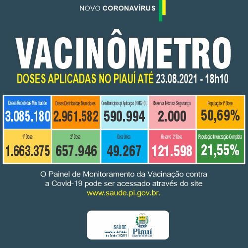 Os casos confirmados no estado somam 315.110 em todos os municípios piauienses. Já os óbitos pelo novo coronavírus chegam a 6.932 e foram registrados em 223 municípios.