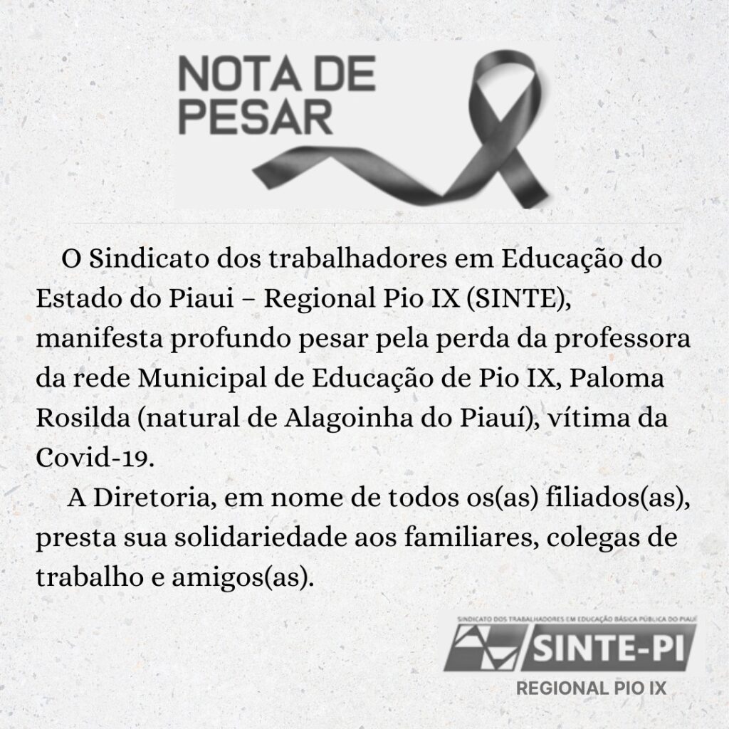 O Sindicato dos Trabalhadores em Educação do Piauí – Pio IX (SINTE), emitiu uma nota de pesar.