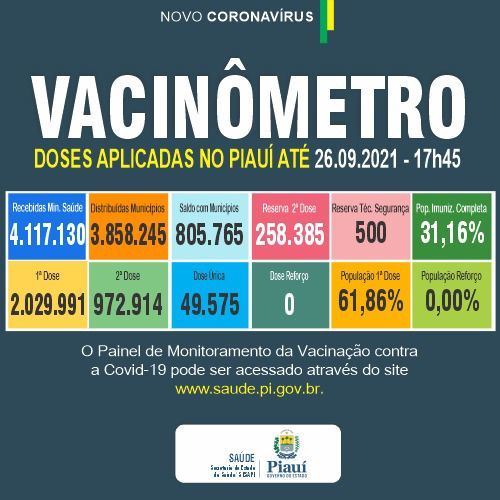Dos leitos existentes na rede de saúde do Piauí para atendimento à Covid-19, há 168 ocupados, sendo 85 leitos clínicos, 76 UTIS e 7 leitos de estabilização. As altas acumuladas somam 22.802 até o dia 26 de setembro de 2021.